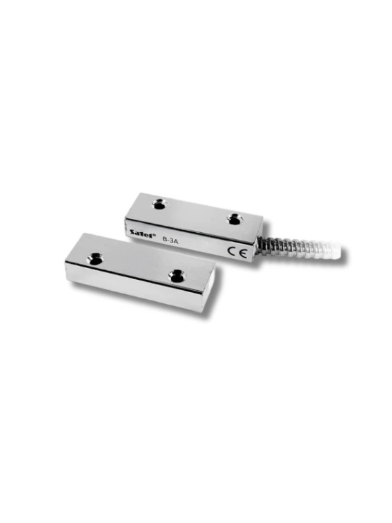 B-3A to boczny kontaktron magnetyczny o wzmocnionej konstrukcji, przeznaczony do zastosowań wymagających wysokiej odporności mechanicznej i zabezpieczenia przed sabotażem. Czujnik oraz magnes umieszczone są w solidnych metalowych obudowach, a wyprowadzenia elektryczne chronione są dodatkowym pancerzem przewodowym, który zabezpiecza instalację przed przecięciem, zerwaniem lub próbami manipulacji.